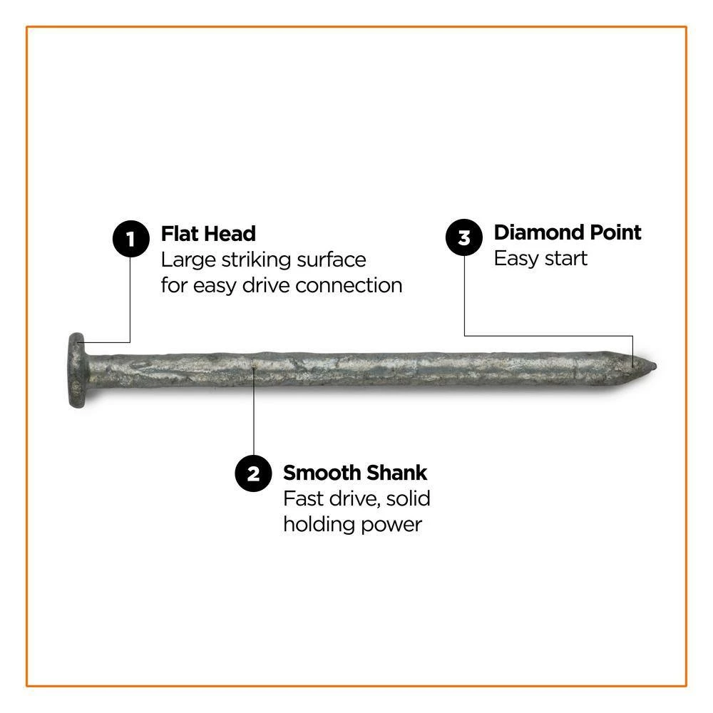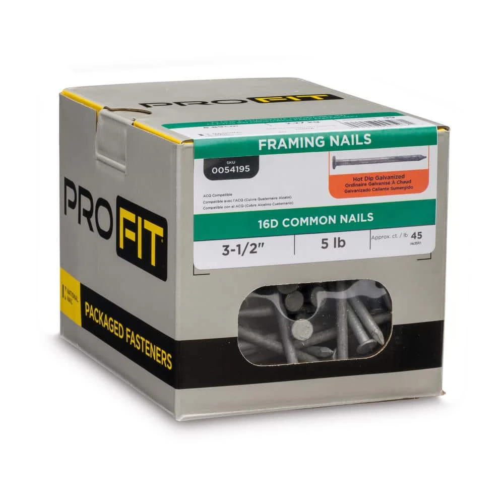 Exterior common nails are used for framing, carpentry, and general construction where a smooth shank for driving ease is desired. PRO-FIT common nails are hot dipped galvanized, conforming to ASTM A153 for corrosion resistance in outdoor projects. Rely on PRO-FIT common nails for just about any exterior project where you use construction lumber. PRO-FIT common nails are fast to drive with a diamond point and a smooth shank. The head design is 3-4 times the size of the shank, providing easy connection and reliable holding power.