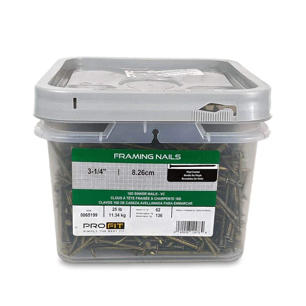 PRO-FIT sinker nails are for general interior construction, carpentry, and framing projects where construction lumber is being used. They are vinyl coated, which provides lubrication to improve driving speed and holding power. The flat countersunk head features a checkered pattern that keeps the hammer from slipping during the strike, providing a sure connection and easy drive.