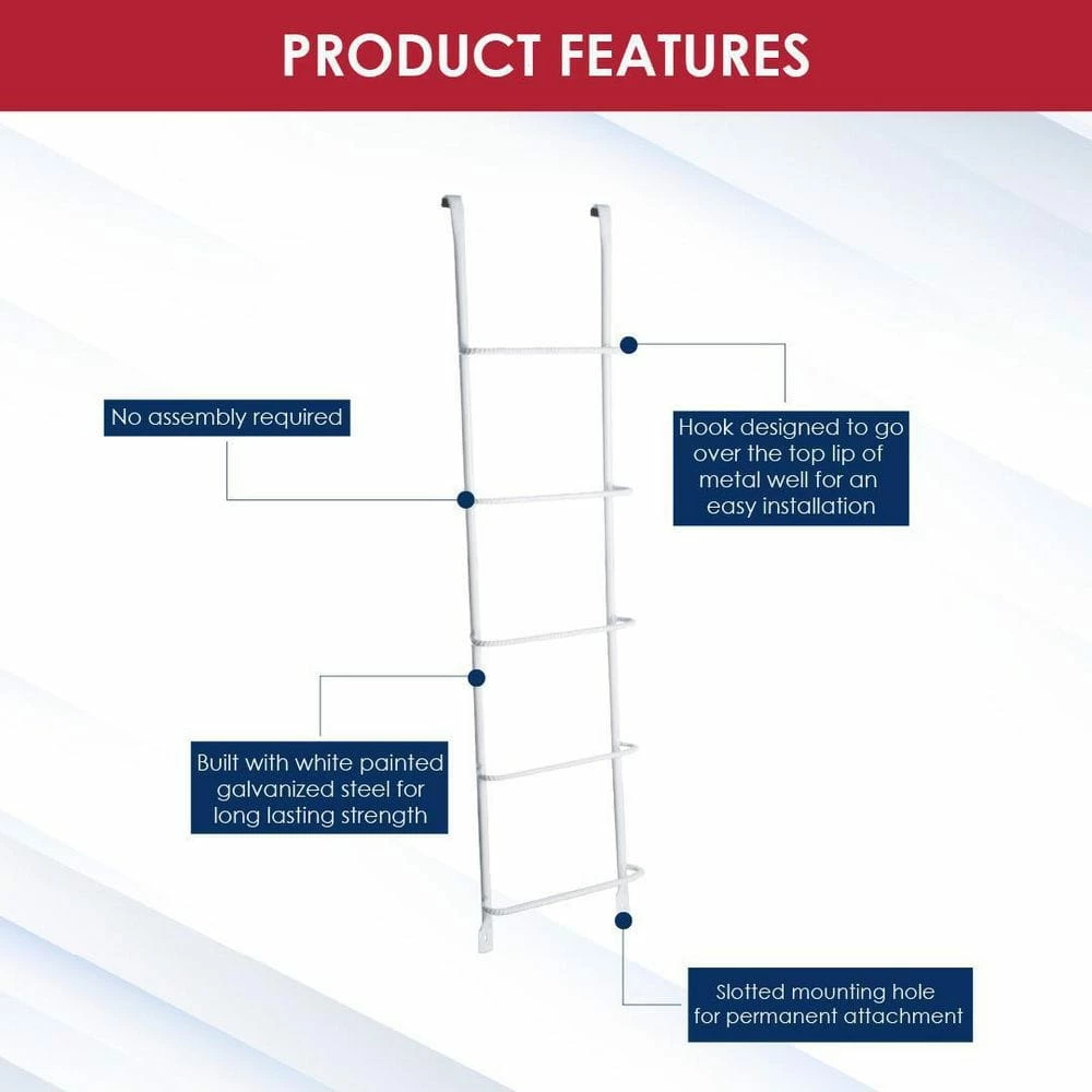 Shape Products 5-Step Steel Window Well Escape Ladder is designed for 6 ft. metal egress window wells. Made from white painted galvanized steel for long lasting strength. Installation is quick and easy with a hook designed to go over the top lip of a metal well and slotted mounting holes for permanent attachment. No assembly required.